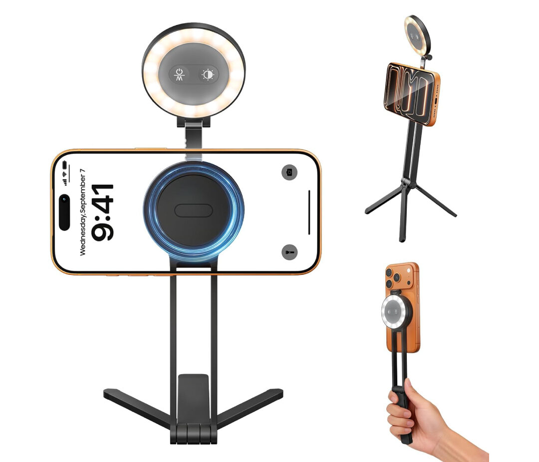 • All-in-One Magnetic Tripod & Fill Light – Combines a magnetic phone holder with an integrated selfie light, enabling quick setup for vlogging, streaming, or on-the-go filming without extra accessories.