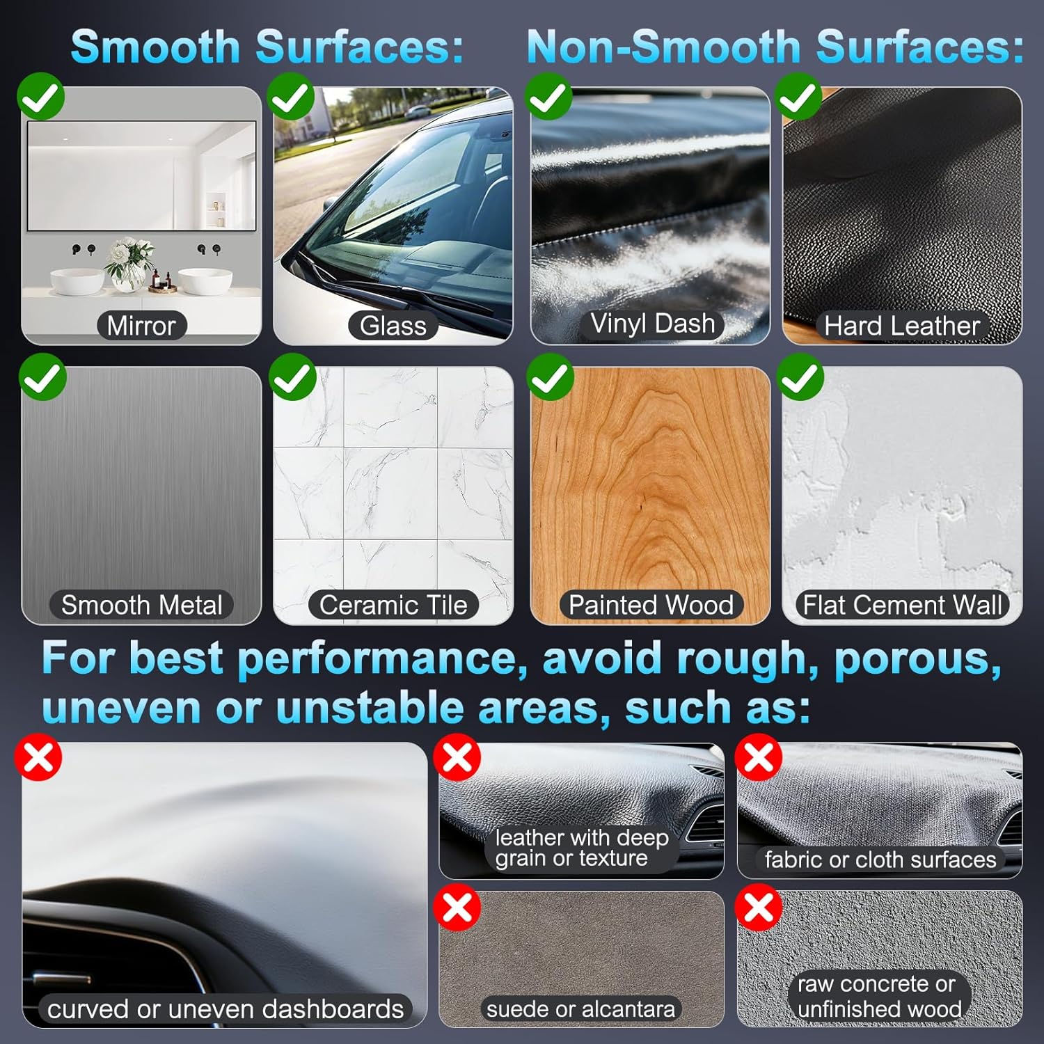 • Strong Suction & Stable Grip – Uses advanced vacuum adhesion and a washable silicone base for secure attachment on smooth surfaces. Includes an adhesive pad for textured areas, keeping your phone steady even on bumpy roads or during sudden stops.